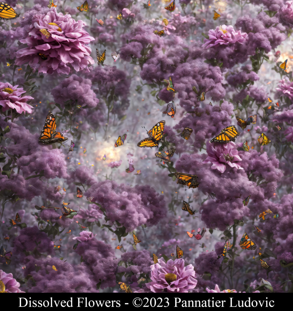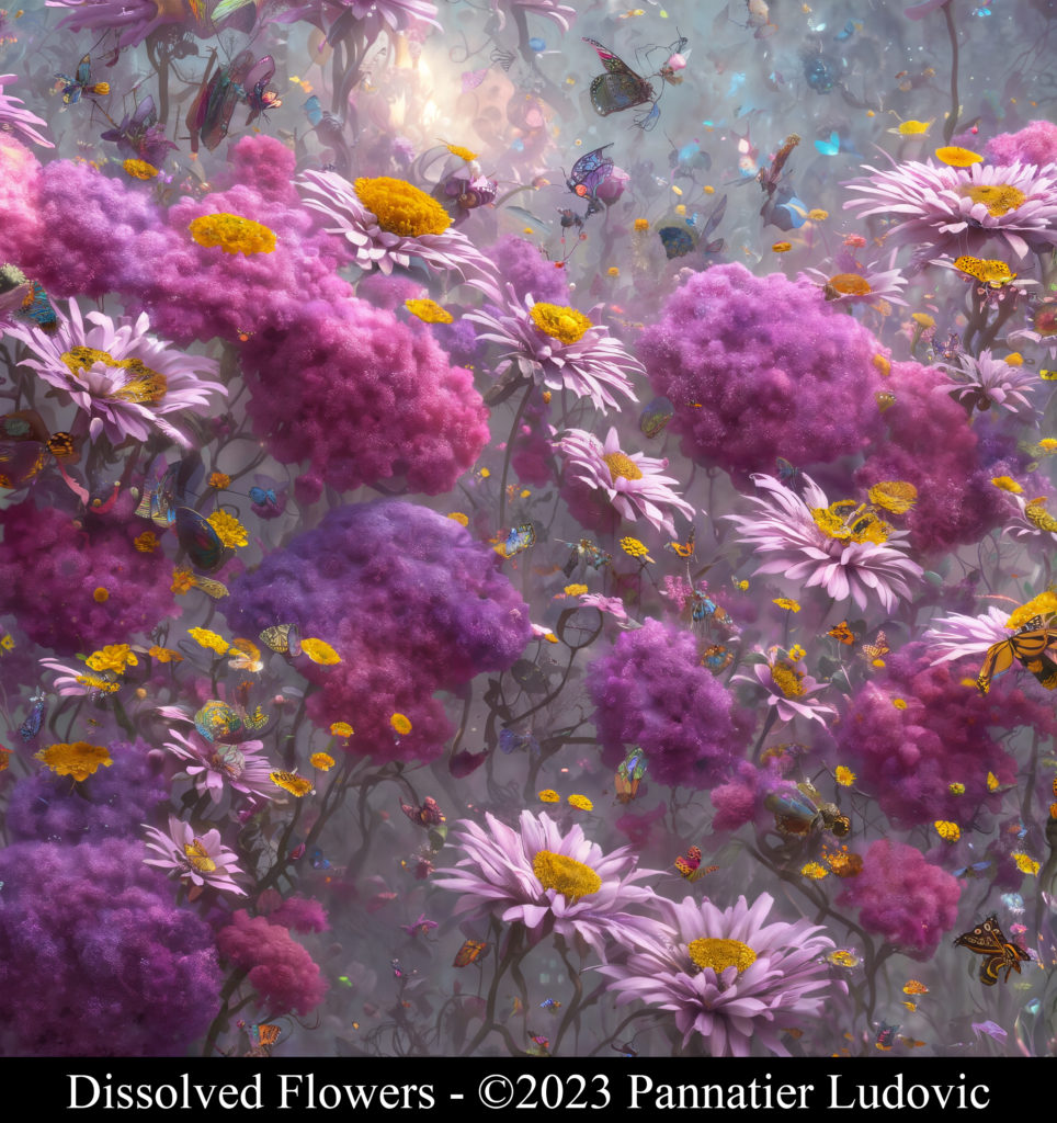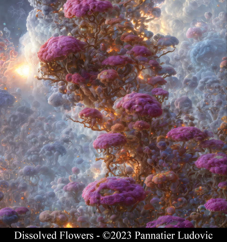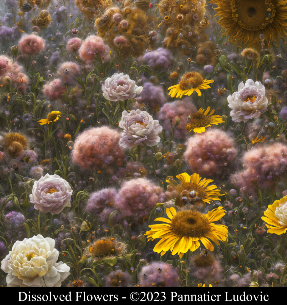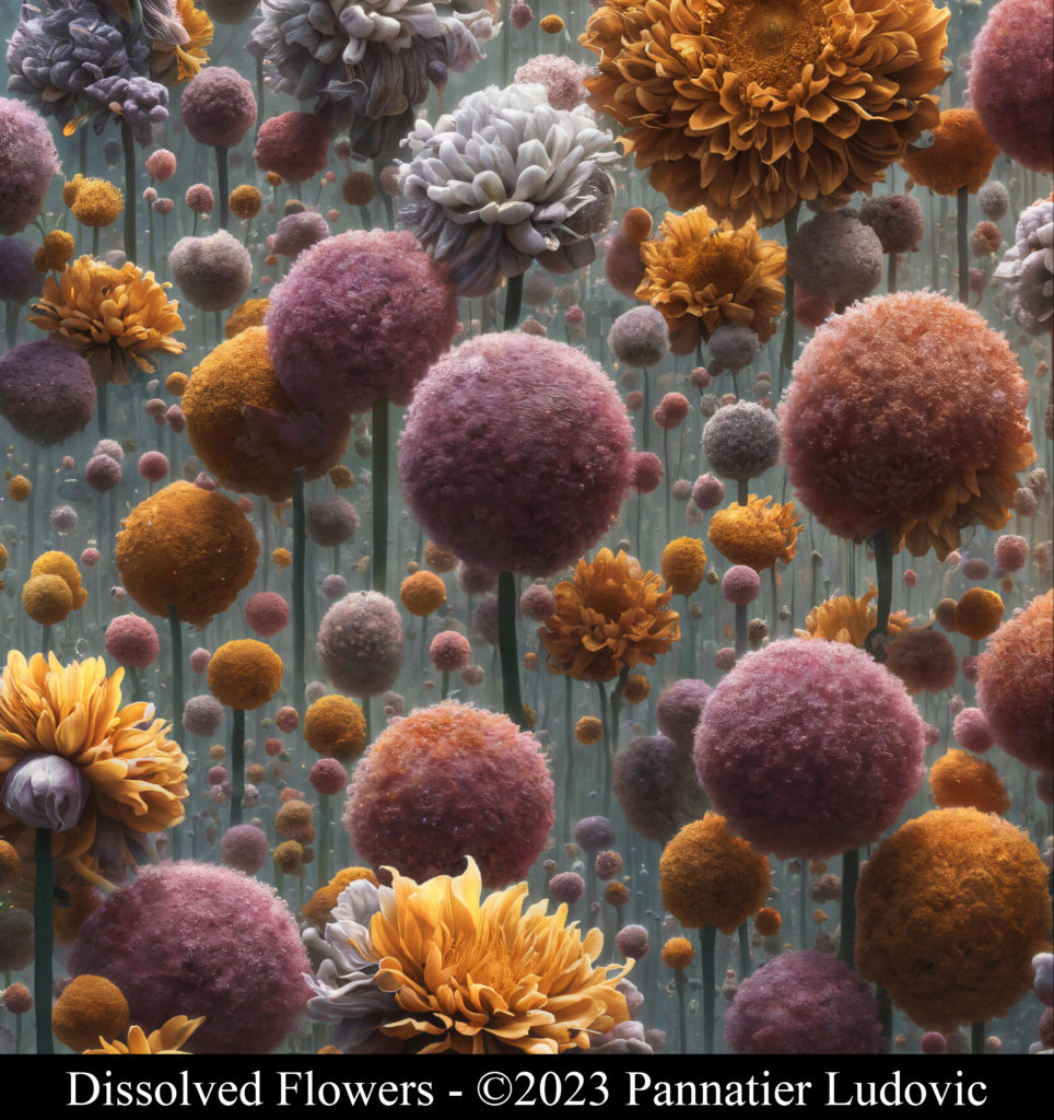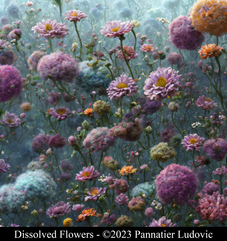 Dissolved Flowers (Les Fleurs Dissoutes) nous questionne sur la réalité. Ces fleurs oniriques n’existent pas, et pourant elles semblent exister. Nous aimerions qu’elles existent, mais pourtant…