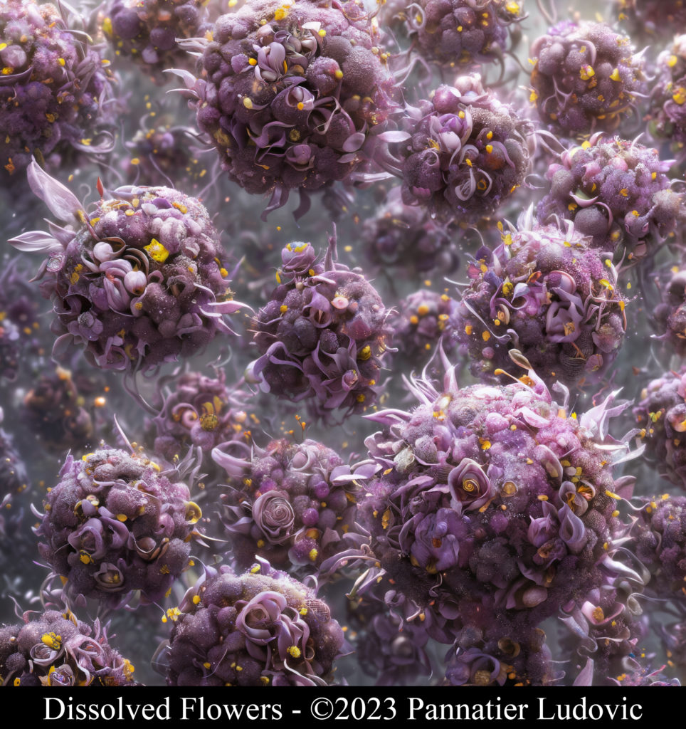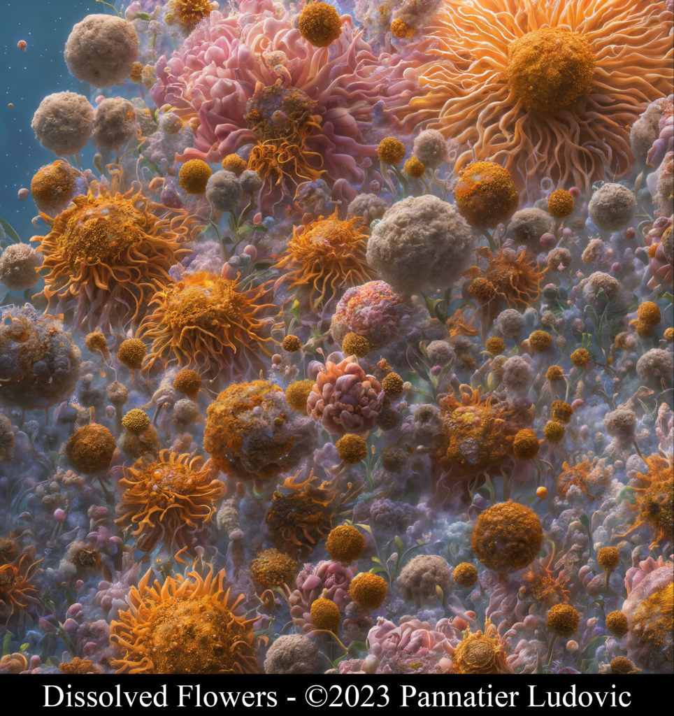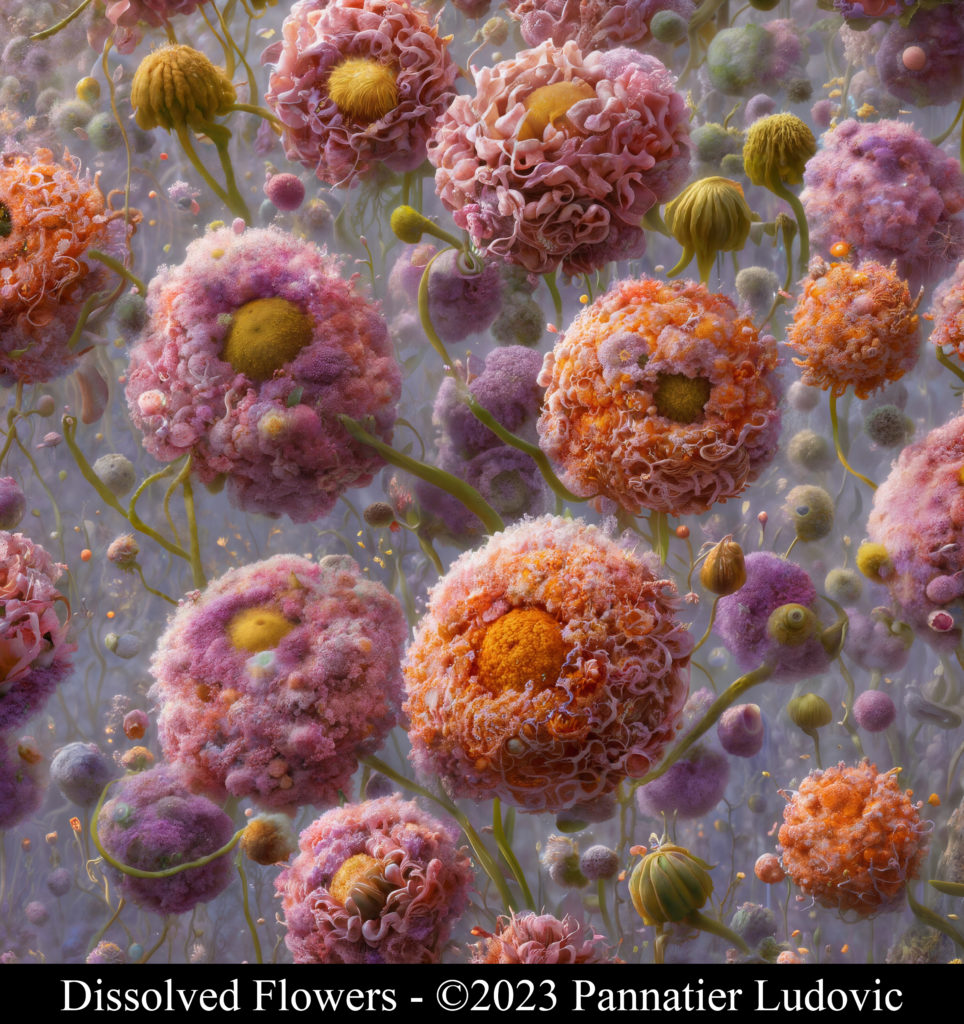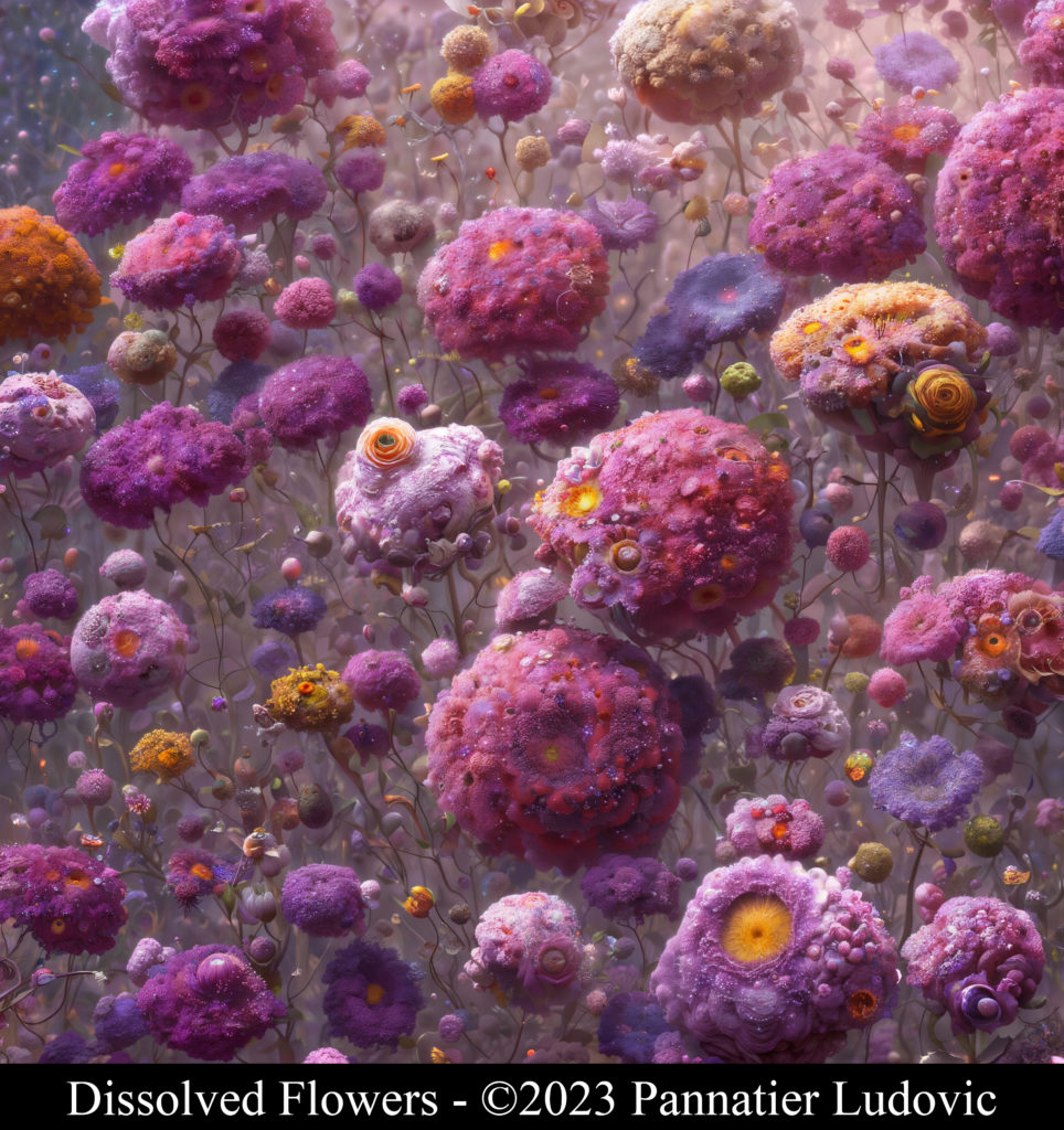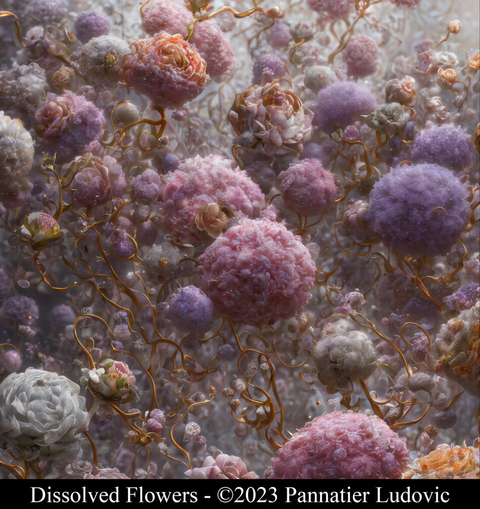 Dissolved Flowers (Les Fleurs Dissoutes) nous questionne sur la réalité. Ces fleurs oniriques n’existent pas, et pourant elles semblent exister. Nous aimerions qu’elles existent, mais pourtant…