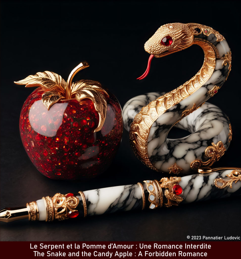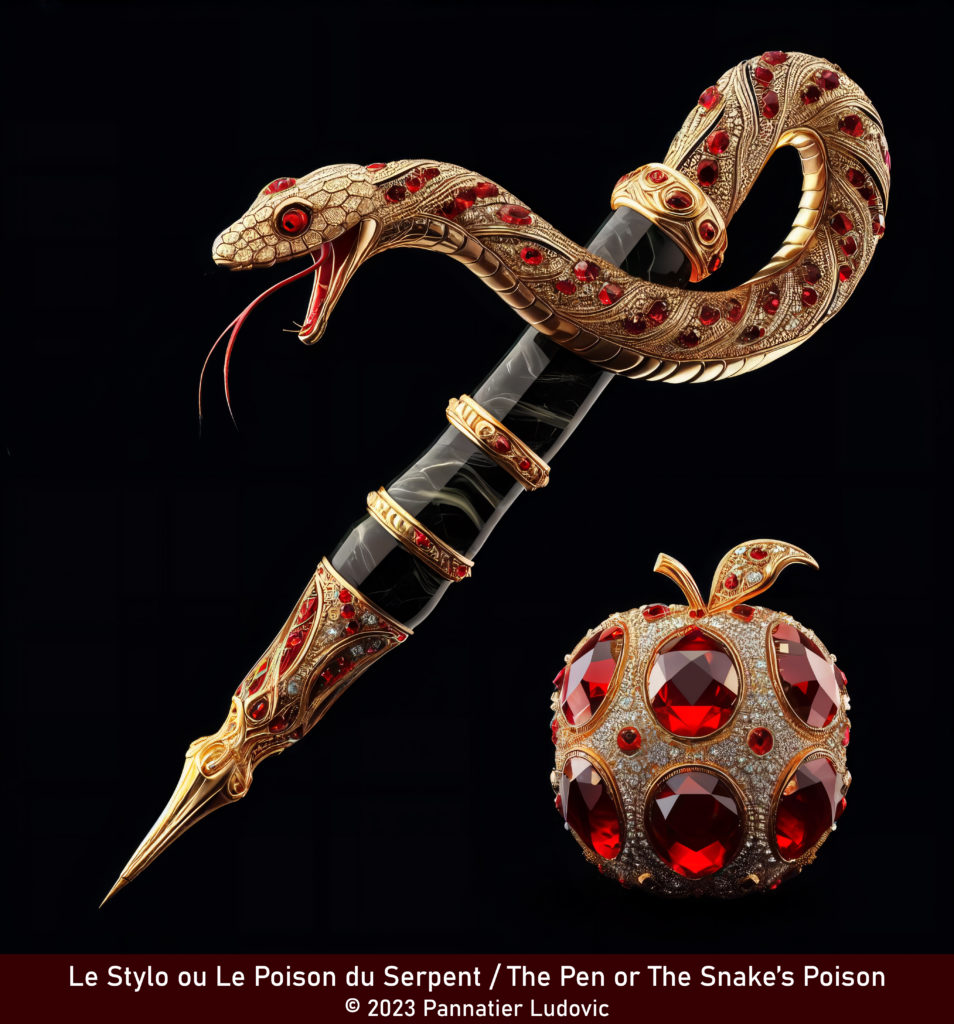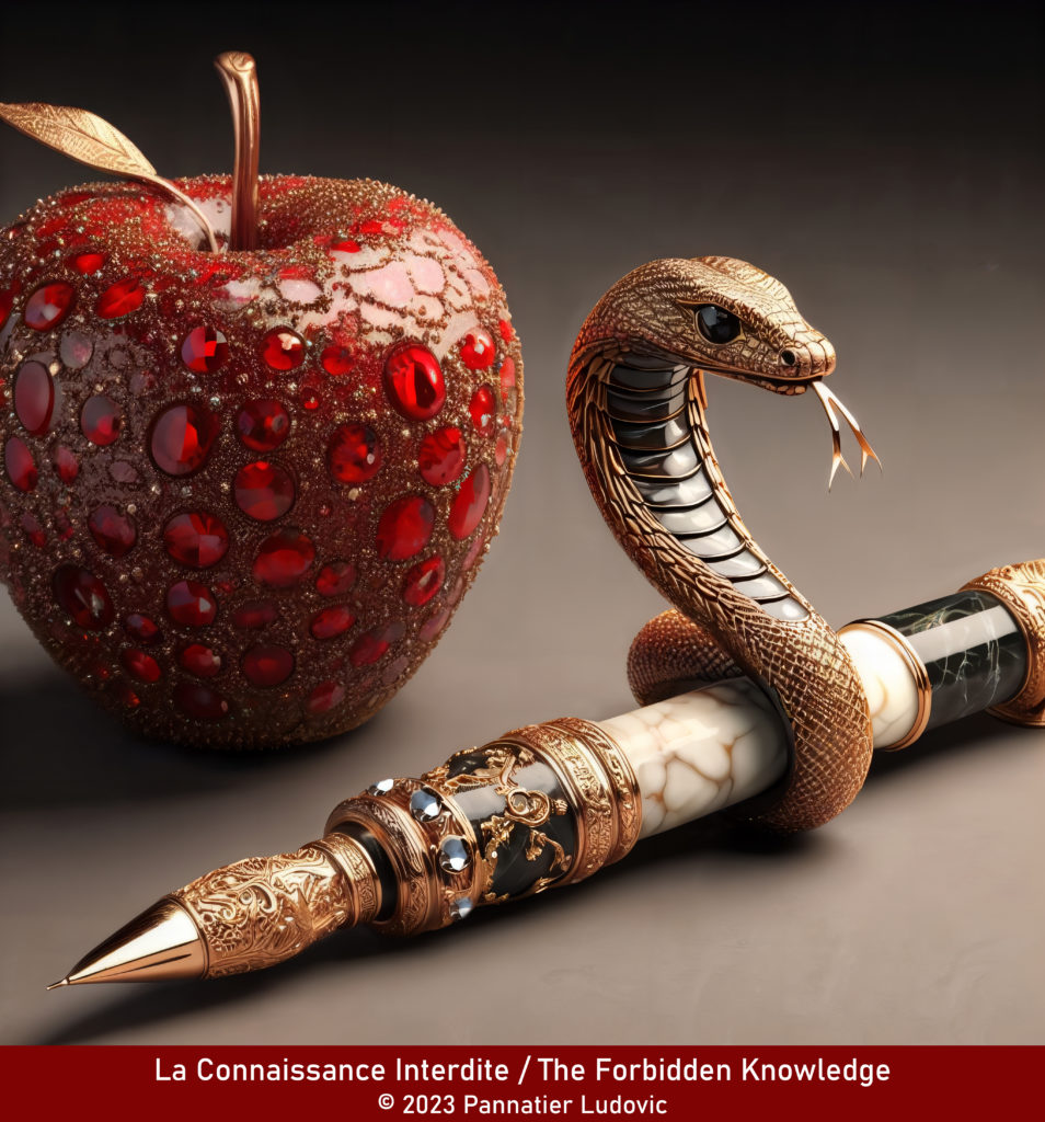 Cette série est une réécriture de la Genèse. Le Serpent fusionne avec le Stylo, symbole de la connaissance. On y retrouve le fruit de la connaissance sous la forme d’une pomme en bijoux. Chaque image est reproduite comme une photographie luxueuse de produit.